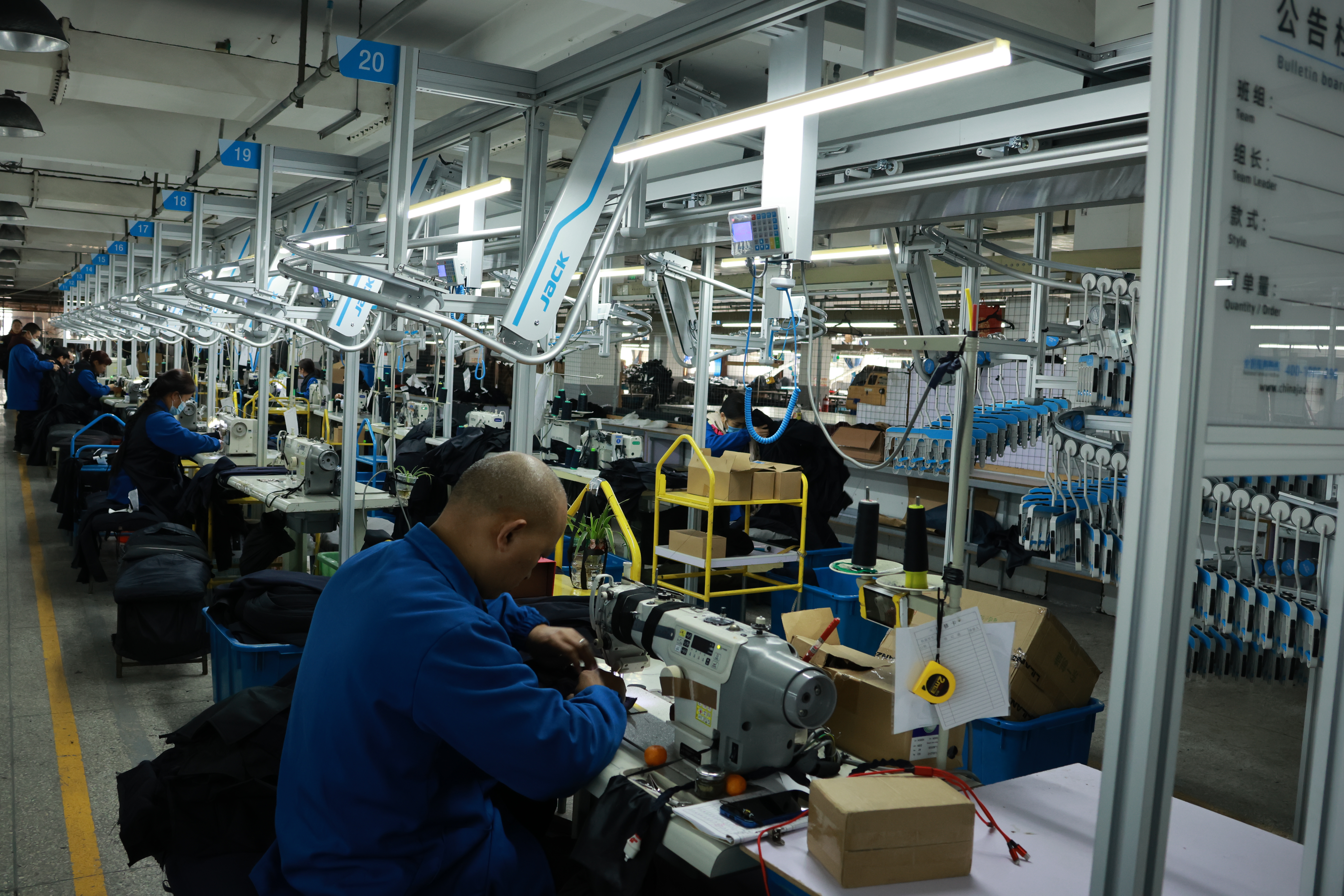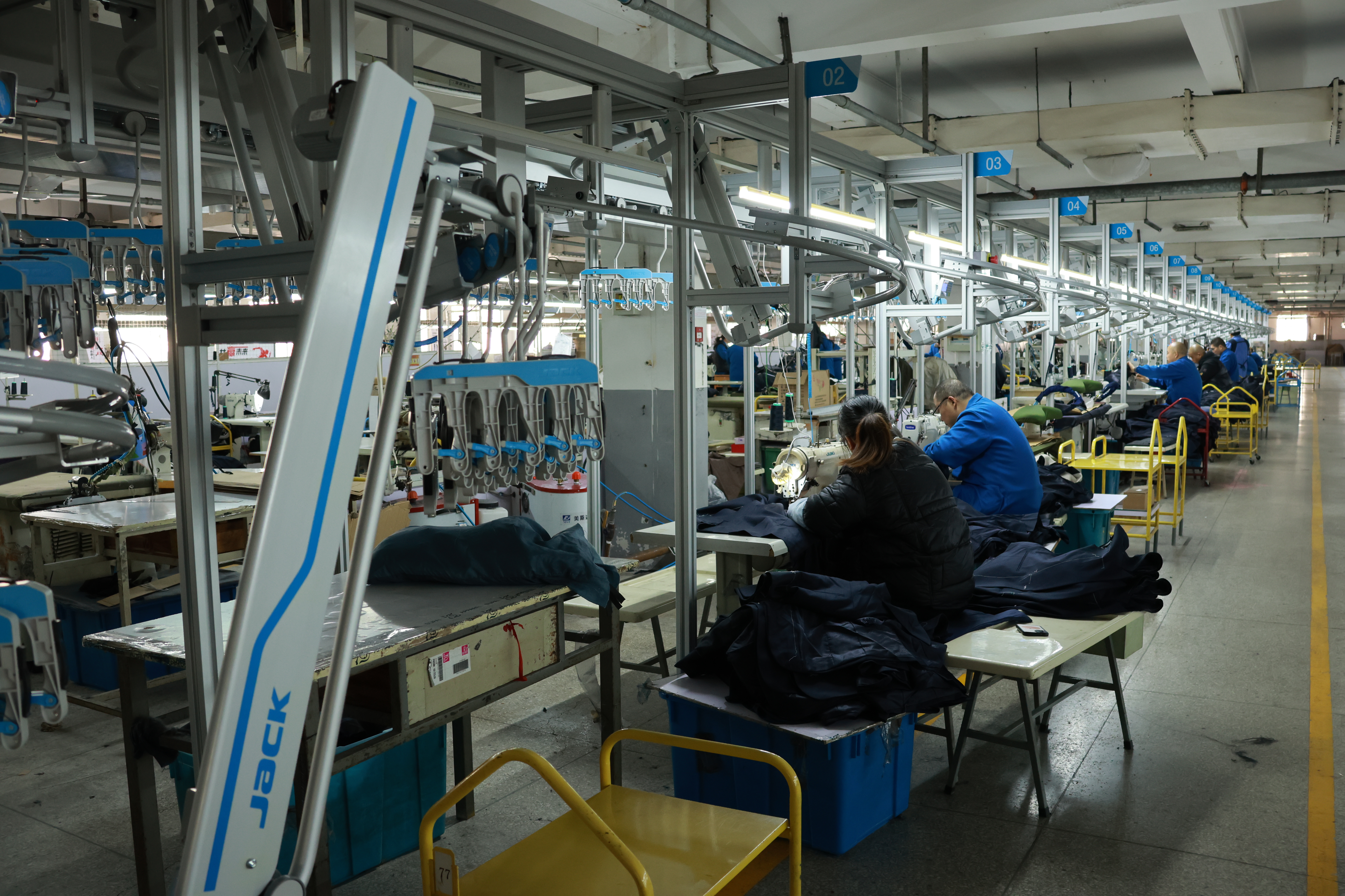 产品质量:运用西班牙(艾维斯)服装CAD设计排版系统及配套电脑自动裁床系统进行设计、打样、制版、裁剪等,采用德国、意大利、日本等国引进的高档缝制、整烫设备及先进的服装吊挂流水线进行流水作业,并严格按照ISO9001质量管理体系及ISO14001环境管理体系的标准,从面辅料进厂,半成品直至成品出厂,层层把关,道道检验,不合格产品不流入下一道工序,不出车间、不出厂,以确保实现生产全过程的控制,从而保证服装质量。