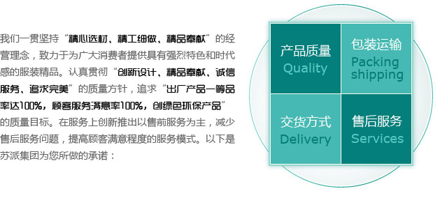 一、 产品质量:运用西班牙(艾维斯)服装CAD设计排版系统及配套电脑自动裁床系统进行设计、打样、制版、裁剪等,采用德国、意大利、日本等国引进的高档缝制、整烫设备及先进的服装吊挂流水线进行流水作业,并严格按照ISO9001质量管理体系及ISO14001环境管理体系的标准,从面辅料进厂,半成品直至成品出厂,层层把关,道道检验,不合格产品不流入下一道工序,不出车间、不出厂,以确保实现生产全过程的控制,从而保证服装质量。 二、 包装运输:严格按要求进行包装,采取免受雨水、潮湿、震荡和撞击损坏的措施,以使其在正常装卸和操作条件下货物能安全无损运抵达客户手中。 三、 交货方式:将以短时间、发放便捷等方式为客户提供优质服务,交货时间及地点将严格按照规定的交货时间交付到客户指定地点。 四、 售后服务: