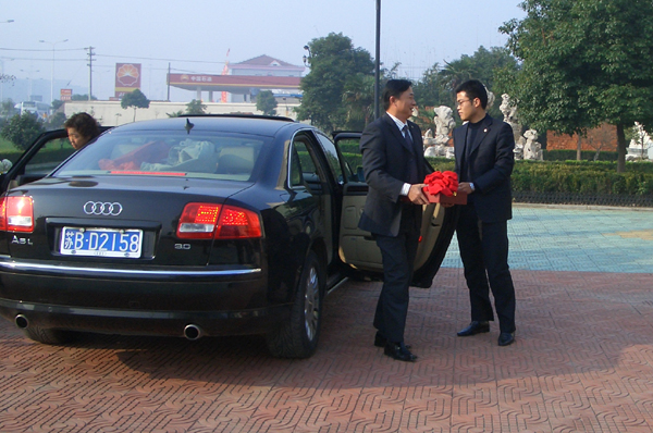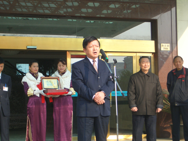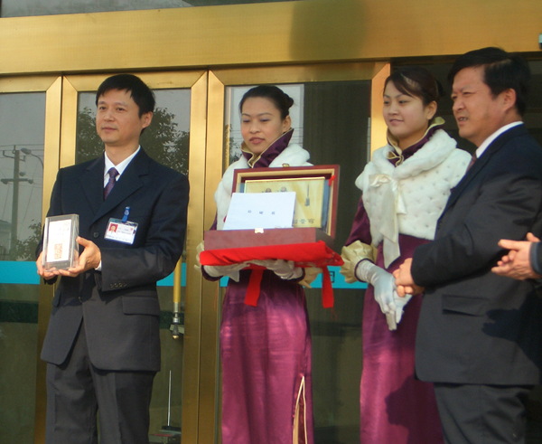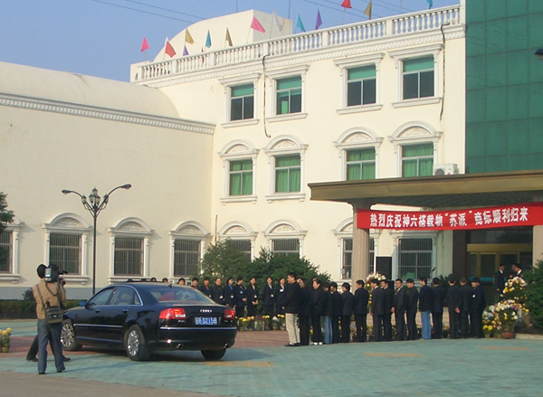 副总经理俞建龙手捧神六搭载物两枚“苏派”商标下车