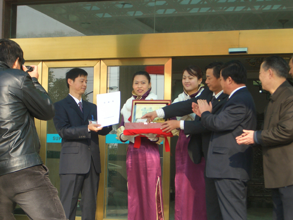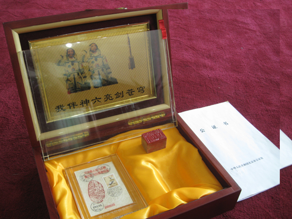 记者在现场看到,“神六”搭载的两枚“苏派”商标分装在两个精美的木盒内,附有北京市公证处的公证书,两枚商标的公证编号依次为2005022和2005025。
