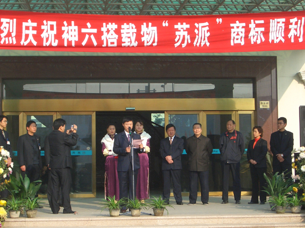 神六搭载物两枚“苏派”商标经过航天局清点、盖章等一系列测试后,于 神六搭载物苏派商标回到家乡后,苏派集团举行了盛大的欢迎仪式。时任璜土镇党委书记褚华庭、璜土镇部分企业家等相关人士出席了欢迎仪式。 欢迎仪式上,副总经理俞建龙亲手将装有神六搭载物两枚“苏派”的盒子交到苏派集团公司董事长俞建新的手中。党委书记褚华庭和董事长俞建新共同为神六搭载物揭幕。褚华庭表示:作为全国服装品牌唯一搭载物的顺利归来,不仅是苏派的光荣,更是璜土镇乃至江阴人民的光荣。 据悉,神六也是最后一批搭载非试验性物品的飞船。 媒体相关报道 本报讯 江阴企业的商标有幸成为中国服装品牌第一位“太空游客”,昨天上午,伴随“神六”载人飞船一起遨游太空的“苏派”商标,在获得北京市公证处公证后返回家乡。位于江阴璜土镇的苏派集团举行了盛大的交接仪式。
