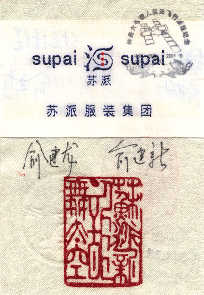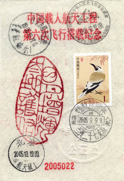 商标的正反面印有“神舟六号载人航天飞行搭载纪念”以及“搭载入仓”等多枚印章和精美图案。